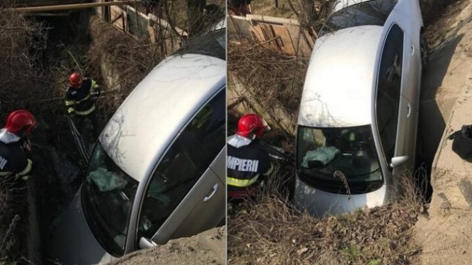 Accident la MIntia. Șofer prăbușit cu mașina într-o rigolă de doi metri