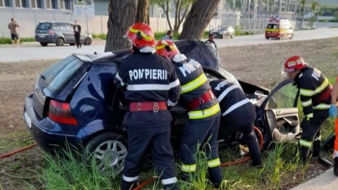 Echipajele de descarcerare ale Inspectoratului pentru Situații de Urgență Hunedoara au intervenit pentru a scoate cele două victime din mașina distrusă în impactul cu copacul.