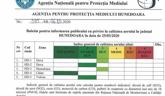 „Vă informăm prin intermediul buletinului de mai jos, că indicii de calitate a aerului, conduc la concluzia că, în zona Deva oras si Hunedoara indicele general de calitate a aerului este BUN, în zona municipiului Vulcan și în vestul municipiului Deva indicele general de calitate a aerului este FOARTE BUN, iar în zona Călan indicele general de calitate a aerului este EXCELENT.