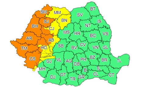 În județele Timiș, Arad, Bihor, Satu Mare, Sălaj, Caraș Severin, precum și în zona de munte a județelor Hunedoara, Alba și Cluj vor fi intervale cu intensificări puternice ale vântului (rafale de 80…90 km/h), vijelii, frecvente descărcări electrice și grindină.Pe arii restrânse vor fi averse torențiale și se vor acumula cantități de apă de peste 35…60 l/mp.