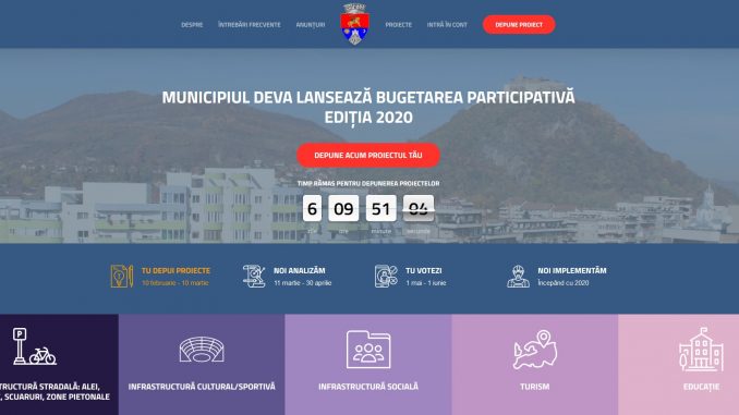 Până marți, 10 martie, orice persoană care a împlinit 18 ani și are domiciliul sau reședința în Deva poate trimite, pe portalul de bugetare participativă de pe www.primariadeva.ro, idei care să contribuie la îmbunătăţirea calităţii vieţii în oraşul de la poalele Cetății. Toate propunerile de proiecte trimise până atunci vor intra în etapa de analiză și validare, programată în perioada 11 marie – 30 aprilie 2020. Propunerile validate vor fi supuse votului cetăţenilor, pe site-ul Primăriei Deva, în intervalul 1 mai – 1 iunie 2020. Fiecare persoană va avea posibilitatea să voteze o singură dată, un singur proiect. Validarea și comunicarea rezultatelor votului vor avea loc în perioada 2-5 iunie 2020. Proiectele selectate în urma votului online vor fi implementate de Primăria Deva. Suma alocată de la bugetul local pentru proiectele selectate prin programul ”Bugetare participativă 2020” este de 500.000 de lei şi va fi distribuită pentru 10 proiecte, cu o valoare de maximum 50.000 de lei/proiect, conform Hotărârii Consiliului Local nr. 6/2020, care poate fi consultată pe site-ul Primăriei Municipiului Deva.