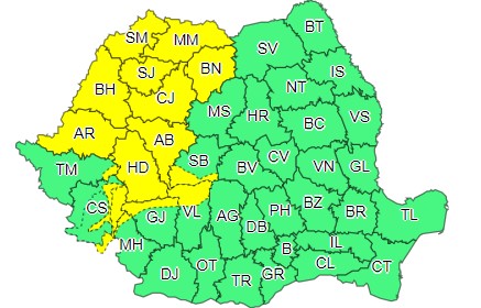 Meteorologii au emis o atenționare de cod galben de vijelii, descărcări electrice și grindină, valabil pentru astăzi, 4 iunie, între orele 12:00 și 22:00. Județele afectate sunt Hunedoara, Arad, Alba, Cluj, Bihor, Sălaj, Bistrița Năsăud, Maramureș, Satu Mare, parțial în Caraș Severin, Gorj, Vâlcea și Sibiu.