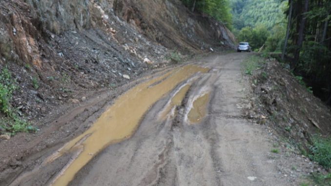 În alte zone, ploile au creat făgaşe uriaşe care fac ca drumul de pământ să semene cu o brazdă întinsă. În unele sectoare, unde noua şosea va urca pe marginea unor prăpăstii, porţiuni din terasament s-au rupt. Au avut loc excavări în versant pentru lărgirea drumului, însă în aceste locuri pământul şi copacii continuă să se prăbuşească. Cu cât şoferii se apropie de Vadu Dobrii, cu atât drumul devine mai greu accesibil. Construcţia noii şosele a fost estimată la peste şase milioane de lei şi finanţate prin Programul Naţional de Dezvoltare Locală, iar până în prezent a fost realizat terasamentul şi câteva podeţe. Sute de copaci au fost tăiaţi pentru a face loc drumului care traversează întinderea sălbatică de pădure şi urcă până la vârful Muncelu (1.140 de metri), unde se intersectează cu DJ 687E Bunlia – Vadu Dobrii, la trei kilometri de Vadu Dobrii.