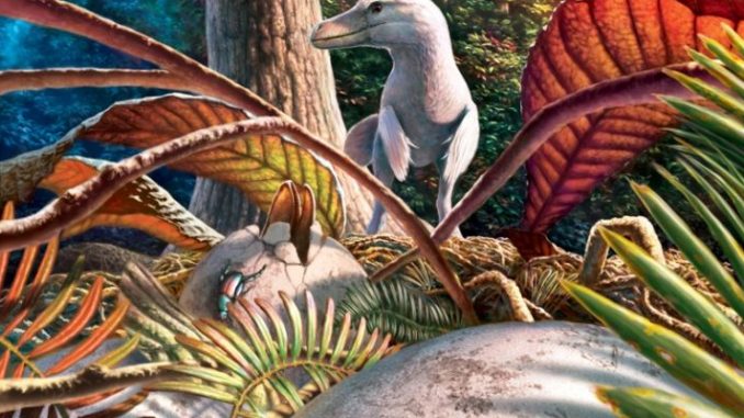 Foto 2: Reconstituirea modului de cuibărit al maniraptorelor cu ouă de tip Pseudogeckoolithus (Sursa: © Julius T. Csotonyi, Canada)