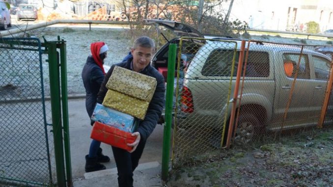 Tiberiu Iacob – Ridzi, primarul municipiului Petroşani, nu numai că a oferit cadouri pentru micuţii de la o grădiniţă, dar a şi cărat personal pachetele alături de voluntari