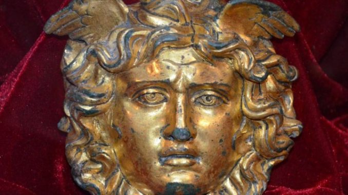 O aplică cu capul Meduzei, descoperită la Ulpia Traiana Sarmizegetusa, impresionează privitorul prin măiestria realizării, perfecțiunea clasică și vechimea ei. Piesa are forma unei măşti și este datată în secolul al II-lea după Hristos. „Figura tânără şi patetică a Meduzei cu faţa ovală, ochii mari migdalaţi, larg deschişi, cu pupilele marcate, cu sprâncenele gingaş subliniate, nasul lung, ascuţit, cu nările uşor dilatate, gura întredeschisă cu dinţii mici şi regulaţi şi colţurile buzelor puţin lăsate în jos, într-o expresie de furie abia disimulată. Părul este bogat, cu şuviţe libere frumos aranjate. Deasupra tâmplelor, cu deosebită grijă, sunt conturate aripioarele. Pe margini, ascunse de buclele părului, se păstrează încă trei nituri de fier pentru fixare”, este descrierea piesei pe site-ul cimec.ro.