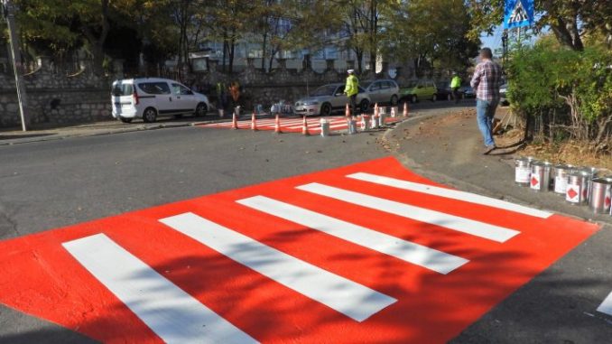 Trecerile de pietoni din reședința județului vor fi vopsite în două culori pentru a fi mai vizibile și mai trainice. Acțiunea a început în cursul zilei de miercuri, 23 octombrie 2019