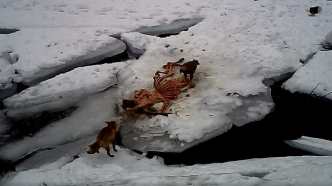 „În timpul activităților de monitorizare, pe baza urmelor din teren, am descoperit pe albia înghețată a unui râu cadavrul unui cerb bătrân (Cervus elaphus) ucis de lup (Canis lupus). Cerbul era consumat doar parțial de către lupi, deoarece accesul la carne era dificil, cadavrul fiind mai mult de jumătate în apă. Am decis să scoatem cadavrul din apă, să montăm în zonă o cameră de monitorizare, și am supravegheat zona timp de două săptămâni. Suspecții principali, lupii nu au mai venit în zonă, dar am filmat următoarele specii de faună: corb (Corvus corax), gaiță (Garrulus glandarius), vulpe (Vulpes vulpes), jder (Martes sp.) și acvilă de munte (Aquila chrysaetos) – prădătorul principal. În imaginile de mai jos puteți vedea cum acvila de munte se hrănește liniștită, în timp ce vulpea așteaptă prudentă”, au precizat reprezentanții Administrației Parcului Național Retezat.