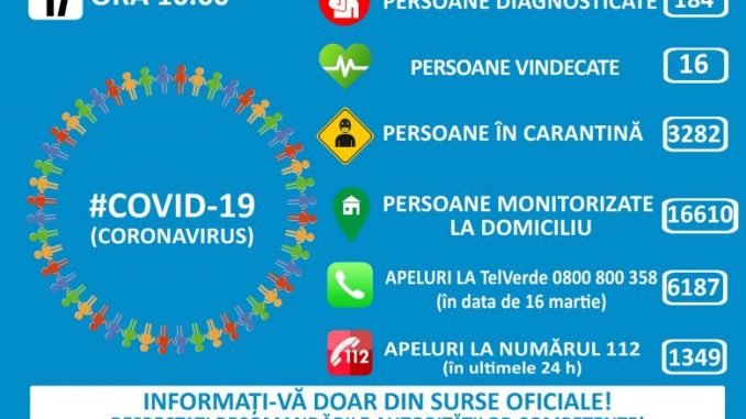 Până astăzi, 17 martie, pe teritoriul României, au fost confirmate 184 de cazuri de persoane infectate cu virusul COVID – 19 (coronavirus).