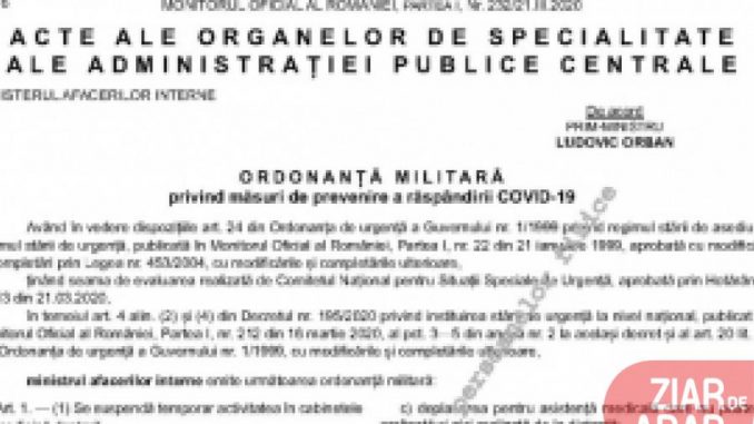 „Având în vedere dispoziţiile art.24 din Ordonanţa de urgenţă nr 1/1999 privind regimul stării de asediu şi regimul stării de urgenţă, publicată în Monitorul Oficial al României, Partea I, nr. 22 din 21 ianuarie 1999, aprobată cu modificări şi completări prin legea nr.453/2004, cu modificările şi completările ulterioare, ţinând seama de evaluarea realizată de Comitetul Naţional pentru Situaţii Speciale de Urgenţă, aprobată prin Hotărârea nr.13 din 21.03.2020, în temeiul art.4 alin. (2) şi (4) din Decretul nr. 195/2020 privind instituirea stării de urgenţă la nivel naţional, publicat în Monitorul Oficial al României, Partea I, nr. 212 din 16 martie 2020, al pct. 3-5 din anexa 2 la acelaşi decret şi al art. 20 lit. n) din Ordonanţa de urgenţă nr 1/1999, cu cu modificările şi completările ulterioare, ministrul afacerilor interne emite următoarea ordonanţă militară: