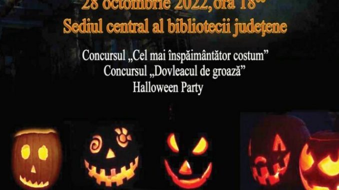 Biblioteca Județeană „Ovid Densusianu” Hunedoara – Deva, cu sprijinul Consiliului Județean Hunedoara, organizează în ziua de 28 octombrie 2022, ora 1800, la sediul central, în curtea instituției, o petrecere de Halloween la care sunt invitați, cu deosebită plăcere, toți prietenii bibliotecii noastre, de la mic la mare.