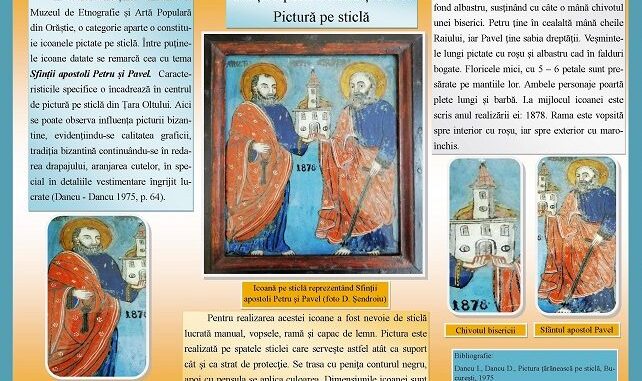 „Pentru această săptămână Muzeul de Etnografie și Artă Populară Orăștie vă propune o întâlnire cu lumea icoanelor pictate pe sticlă. Este vorba despre o icoană ce îi prezintă pe Sfinții apostoli Petru și Pavel. Chiar dacă nu este semnată, ci doar datată, icoana propusă de noi a fost lucrată de mâna talentată a unui zugrav care pare a fi pictat și frescă, observându-se grija pentru detaliu atât în ce privește expresivitatea fețelor personajelor cât și a veșmintelor”, menționează specialiștii muzeului din Orăștie: Muzeograf, Daniela Șendroiu, Conservator, Iustina Bogdan, Arheolog, Adrian Cătălin Căsălean.