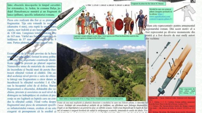 „În cadrul rubricii PIESE REPREZENTATIVE DIN COLECȚIILE MUZEULUI CIVILIZAȚIEI DACICE ȘI ROMANE DEVA am ales să vă prezentăm un obiect a cărui prezență, între descoperirile arheologice este rară. Este vorba de fragmentul unui pilum, sulița specifică legionarului roman. Cu toate că în antichitate a fost folosit pe scară largă, din descoperiri arheologice sunt cunoscute puține exemplare. Exemplarul a fost descoperit în timpul cercetărilor recente la Cetatea dacică de la Ardeu și probabil că prezența în acel loc are legătură cu asediul final și sfârșitul locuirii dacice.