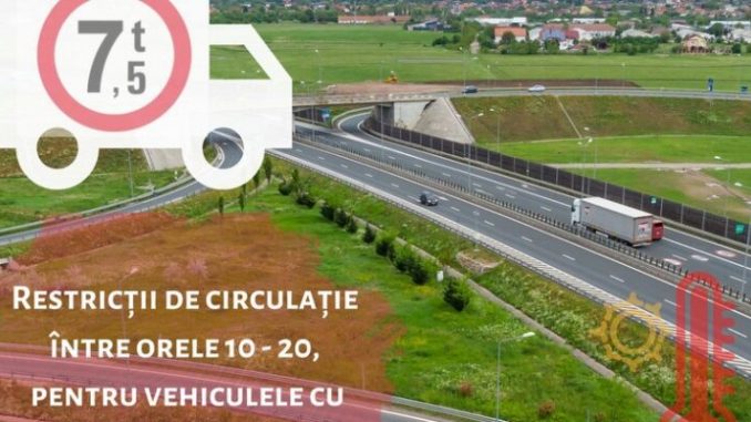 Restricțiile de circulație instituite în zilele de sâmbătă și duminică (23 – 24 iulie), în intervalul orar 10:00 – 20:00, pentru autovehiculele cu masa totală maximă autorizată mai mare de 7,5 t (în județele: Teleorman, Olt, Dolj, Mehedinți, Caraș – Severin, Timiș, Arad, Bihor, Sălaj, Satu Mare) se aplică doar pe sectoarele de drumuri naționale.