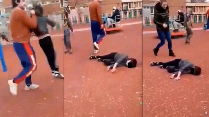 Copilul trântit în cap a rămas neclintit din cauza durerii. Câteva secunde mai târziu, bărbatul se îndreaptă spre un alt copil, îl înjură și îi face aceeași manevră violentă. Mai multe persoane se îndreaptă spre primul dintre copiii agresați pentru a-i acorda ajutor, în timp ce acesta rămâne nemișcat.