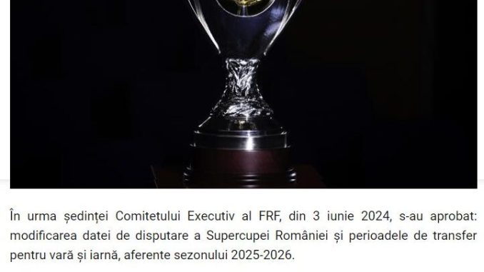 ”Pentru a asigura o perioadă optimă de pregătire pentru debutul în cupele europene, Comitetul Executiv a decis ca Supercupa României să se dispute joi, 4 iulie, în loc de sâmbătă, 6 iulie. În partida care marchează deschiderea sezonului 2024-2025 se vor întâlni campioana din acest sezon, FCSB, și câștigătoarea Cupei României Betano, Corvinul Hunedoara. Conform regulamentului, meciul se dispută pe stadionul campioanei, iar clubul FCSB a solicitat ca partida să se desfășoare pe stadionul Steaua. Ora de disputare va fi anunțată ulterior”, a transmis FRF.