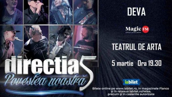 Turneul național Direcția 5 – „Povestea noastră – 30 de ani”, ajunge și la Deva, în 5 martie, la ora 19:30. Concertul va avea loc la Teatrul de Artă Deva.