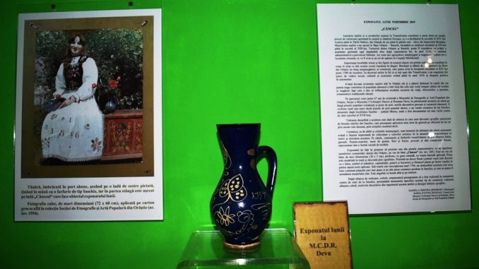 Exponatul lunii noiembrie provine din colecţia Secției de Etnografie și Artă Populară din Orăștie, a Muzeului Civilizației Dacice și Romane Deva. „Exponatul de față este un vas de băut, de mici dimensiuni (20 x 5 cm), piriform, cu gura rotundă, cu toarta laterală aplicată. Piesa este modelată la roată și decorată prin zgrafitare. Prezintă un decor floral (central vasul este decorat cu o lalea, simbol al mândriei, ospitalității, puterii și bucuriei) și fitomorf plasat pe burta vasului în partea opusă torții aplicate. Sub toartă este inscripționat anul 1794, iar dedesubtul acestuia este acea linie continuă șerpuită care mai apare și pe alte piese ceramice produse la Saschiz, și care ar putea fi semnătura meșterului olar. Este angobat cu humă albă și pe interior”, explică specialiștii de la muzeul din Deva.