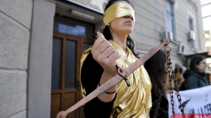 Câțiva membri ai asociației Declic au protestat, luni dimineața, în fața sediului DNA din București, față de decizia procurorilor de a clasa dosarul în care s-a anchetat proiectul minier de la Certej, județul Hunedoara. Aceștia au adus și zeița justiției.