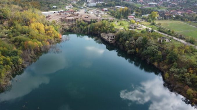 Lacul de carieră, adânc de peste 100 de metri în unele locuri, acoperă în prezent o mare parte din rămășițele vechii exploatări miniere de la Teliucu Inferior.
