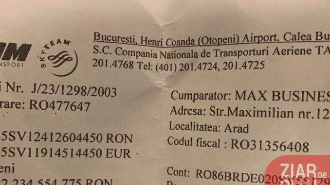 Si acum sa intram in adevarata problema: cine a platit charterul TAROM pentru nunta lui Zetea? Ziuanews a intrat in posesia unor documente, intre care si o factura, care arata ca firma MAX Business Concept SRL este cea care a achitat zborul guvernamental. Avionul cu care au fost aduși de la Bucuresti pentru nunta lui Gabriel Zetea care a avut loc pe data de 12.10.2019 in comuna Oncești Jud Maramureș. De pe tabelul cu pasagerii i-am extras pe următorii: Viorica Dancila cu soțul, Rovana Plumb cu soțul, Lia Olguța Vasilescu, Eugen Teodorovici, Dragoș Titea, Mihai Busuioc, Mihai Fifor, SPP -isti, aghiotanti etc. Avionul a costat 55.000 lei net, firma nefiind plătitoare de TVA. Avionul charter respectiv are o capacitate de 20 persoane, fiind o aeronava ATR 42. Traseul a fost pe ruta Bucuresti – Baia Mare, plecare 12.10.2019 și retur 13.10.2019.